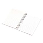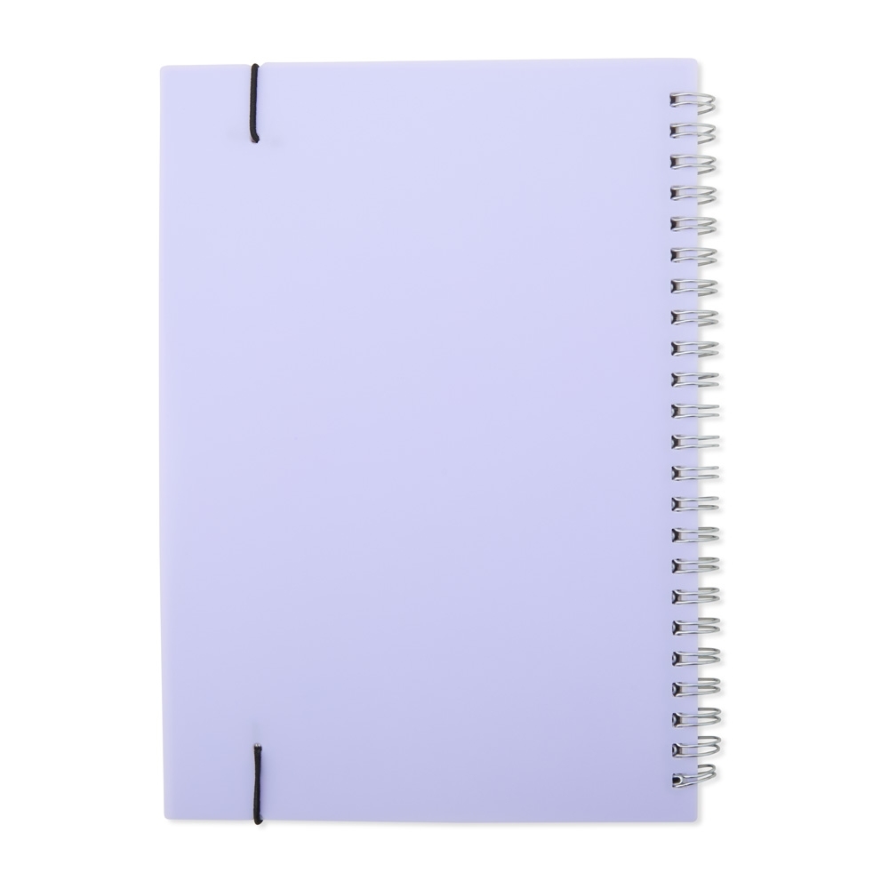 Caderno A5 com capa plástica e elástico para lacre, contém aproximadamente 80 folhas marfim com pauta.