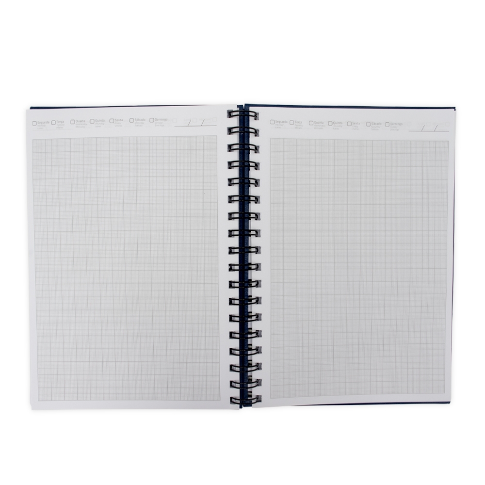 Caderno com capa em cromato e wire-o metálico. Possui aproximadamente 86 folhas pautadas e páginas para: dados pessoais, calendários de 2023 à 2025, planejamentos e endereços de contatos.