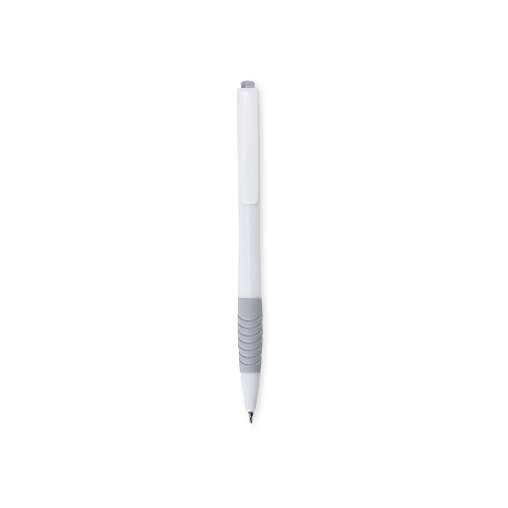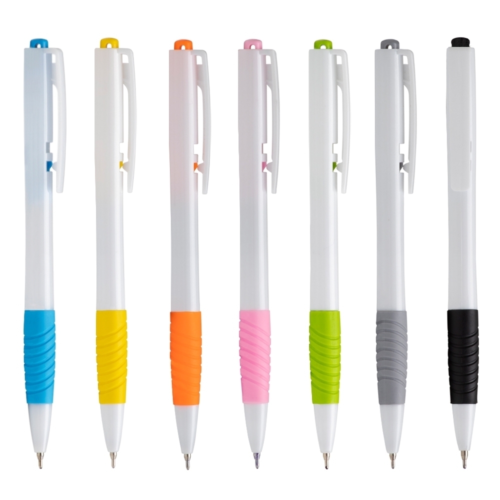 Caneta plástica com detalhe emborrachado e acionamento por clique, carga esferográfica azul 0.8mm.