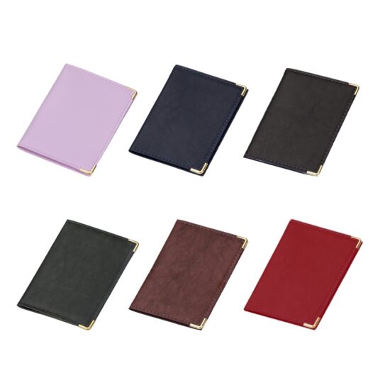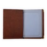 Porta documento em couro sintético com cantoneira dourada, possui 4 divisórias plásticas grande e duas divisórias pequenas.